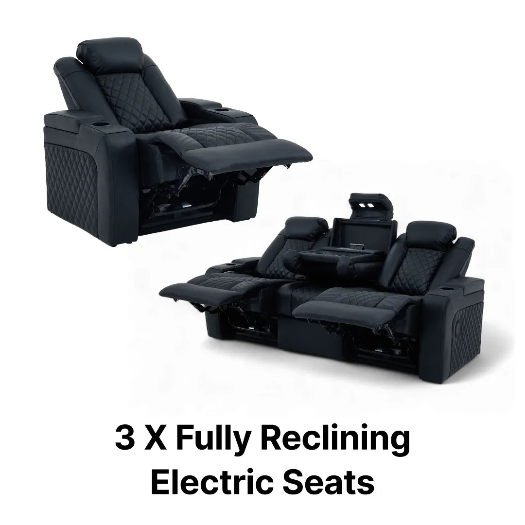 The Milano 3+1 Genuine Leather Sofa Set in Black is a premium recliner package combining one full 3-seater power sofa with two matching recliner chairs. Designed for modern living, this 3+1 cinema sofa set is upholstered in top grain real leather and equipped with advanced features such as USB/USB-C charging on the recliner buttons, power lumbar support, adjustable power headrests, Bluetooth audio (3-seater), storage, and more.