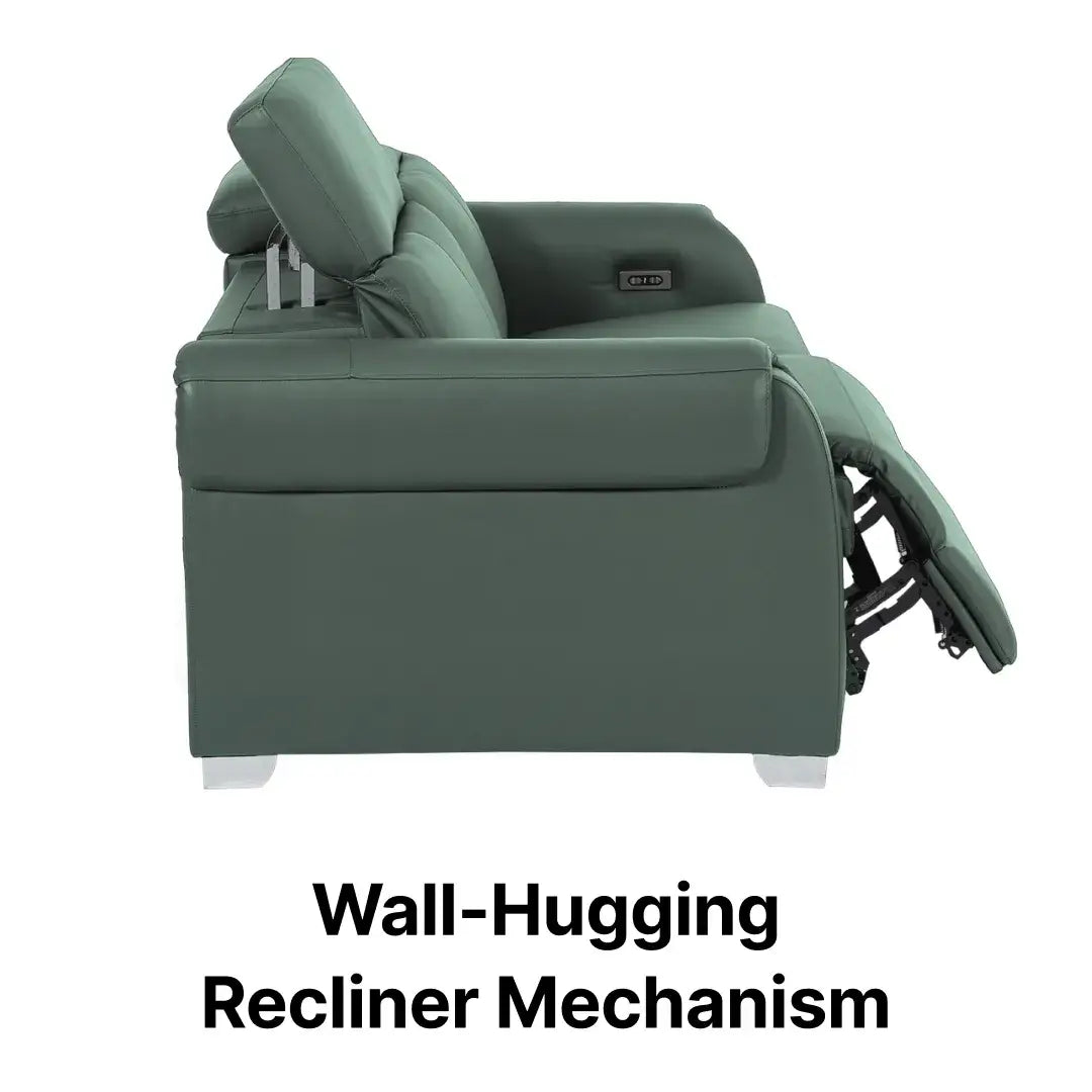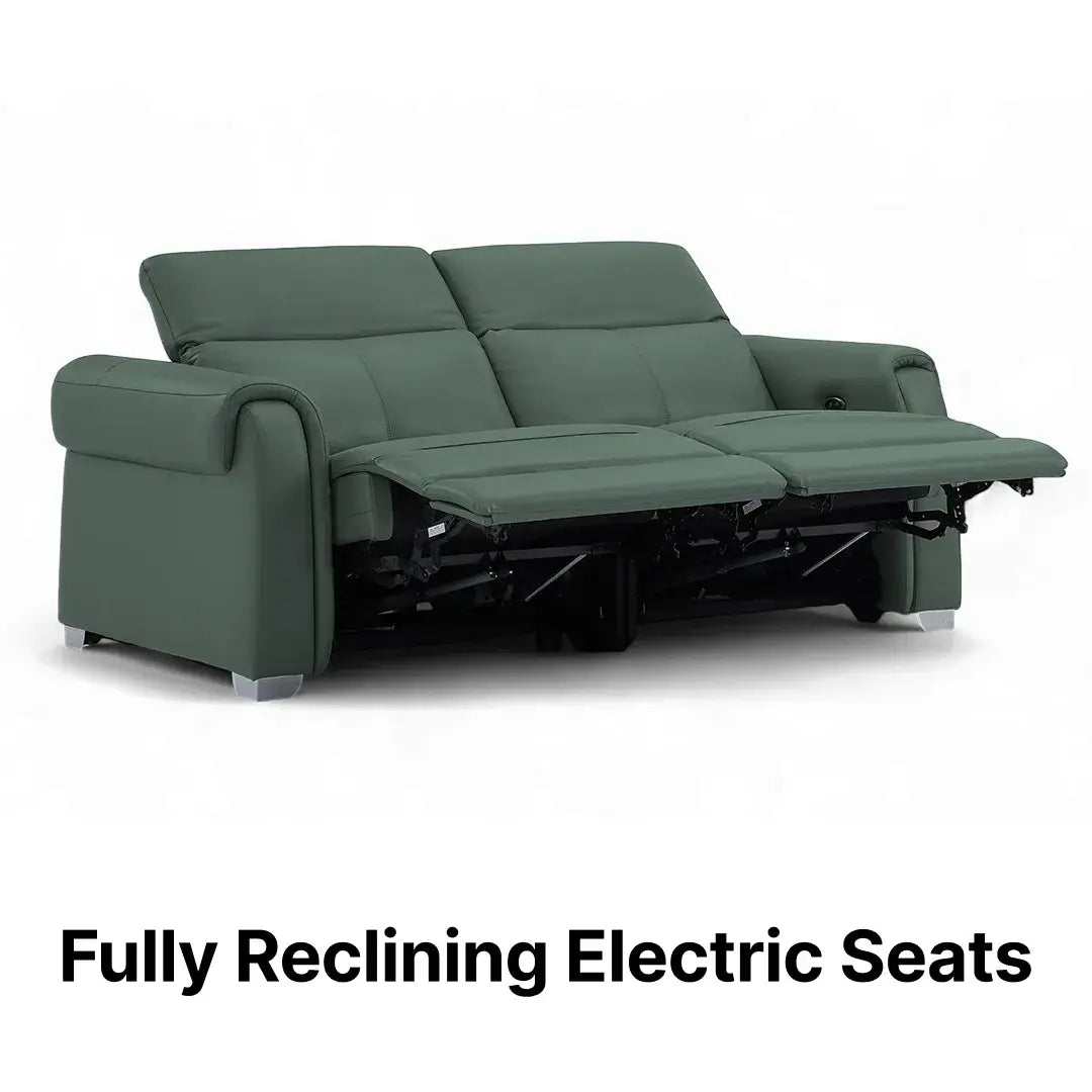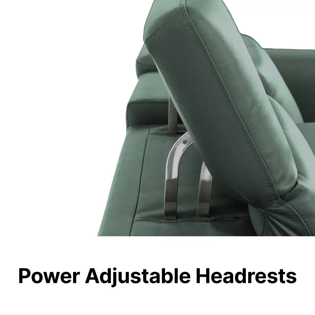 The Turin 3 Seater Real Leather Recliner Sofa turns movie nights into a ritual. Finished in calm green top-grain real leather, this hi-tech home cinema sofa combines power recline, massage, USB charging, power headrests and supportive lumbar design — a sleek three-seat power recliner made for everyday luxury.
