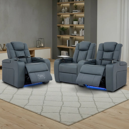 Real Leather 3+1 Recliner Cinema Sofa Set In Blue with Power Headrest, Power Recliner, Drop-Down. . .