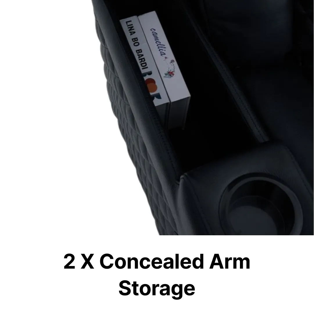 Designed to offer the same luxury experience as our 3+2+1 Milano suite, this black leather electric recliner chair is fully loaded with smart features — including USB & USB-C on the recliner buttons, power headrest, power lumbar support, massage, two cup holders, arm storage, smooth electric recline, and a reset (home) button — all wrapped in a compact 1-seater format.