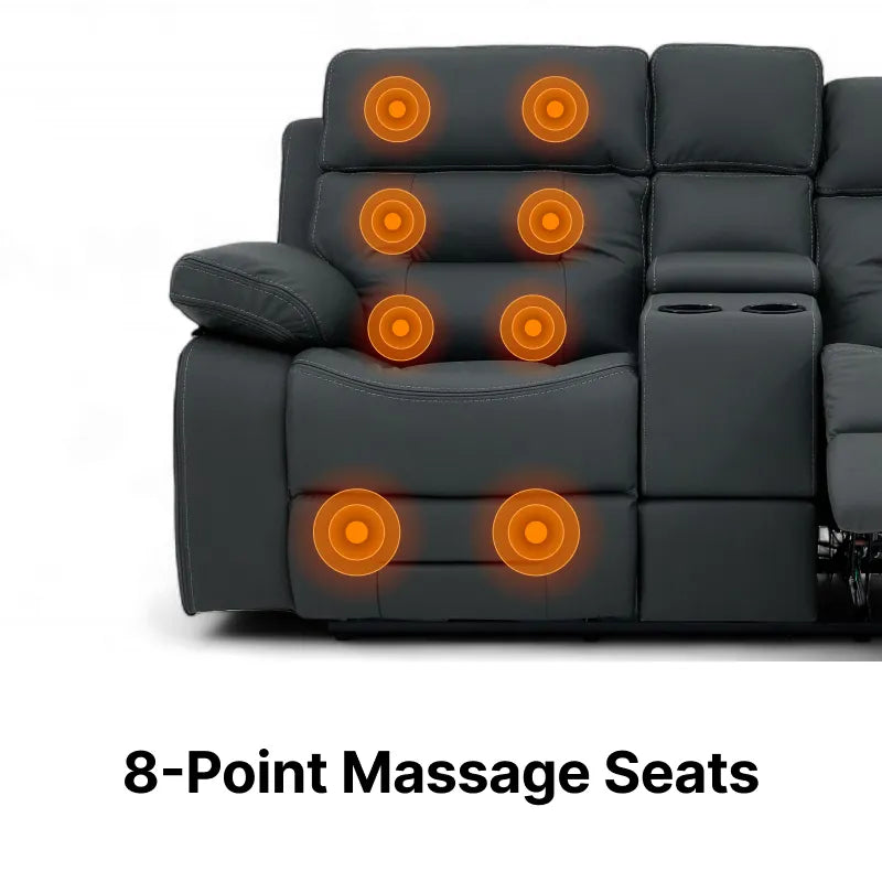 Transform your space with the Sicily 2-Seater Recliner Sofa with Console (Grey Top-Grain Leather). Enjoy the perfect mix of luxury, technology, ergonomic comfort, and integrated massage.