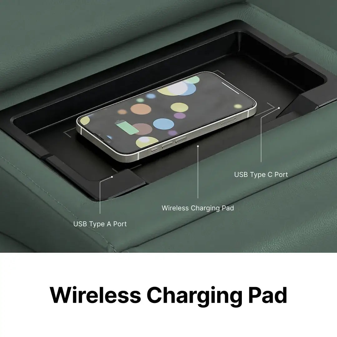 Meet the Turin 2 Seater Real Leather Electric Recliner Sofa in green — a compact home cinema sofa with serious comfort. With power recline, massage, USB, adjustable headrests, lumbar support and a clever middle console with storage and wireless charging, Turin turns any lounge into a sleek cinema sofa zone.