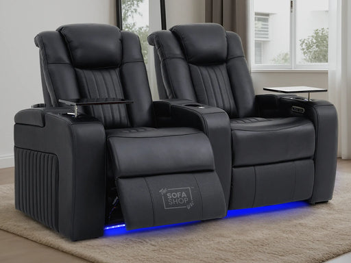 2 Seater Real Leather Power Reclining Cinema Sofa in Black with Console, USB Ports, Table,. . .