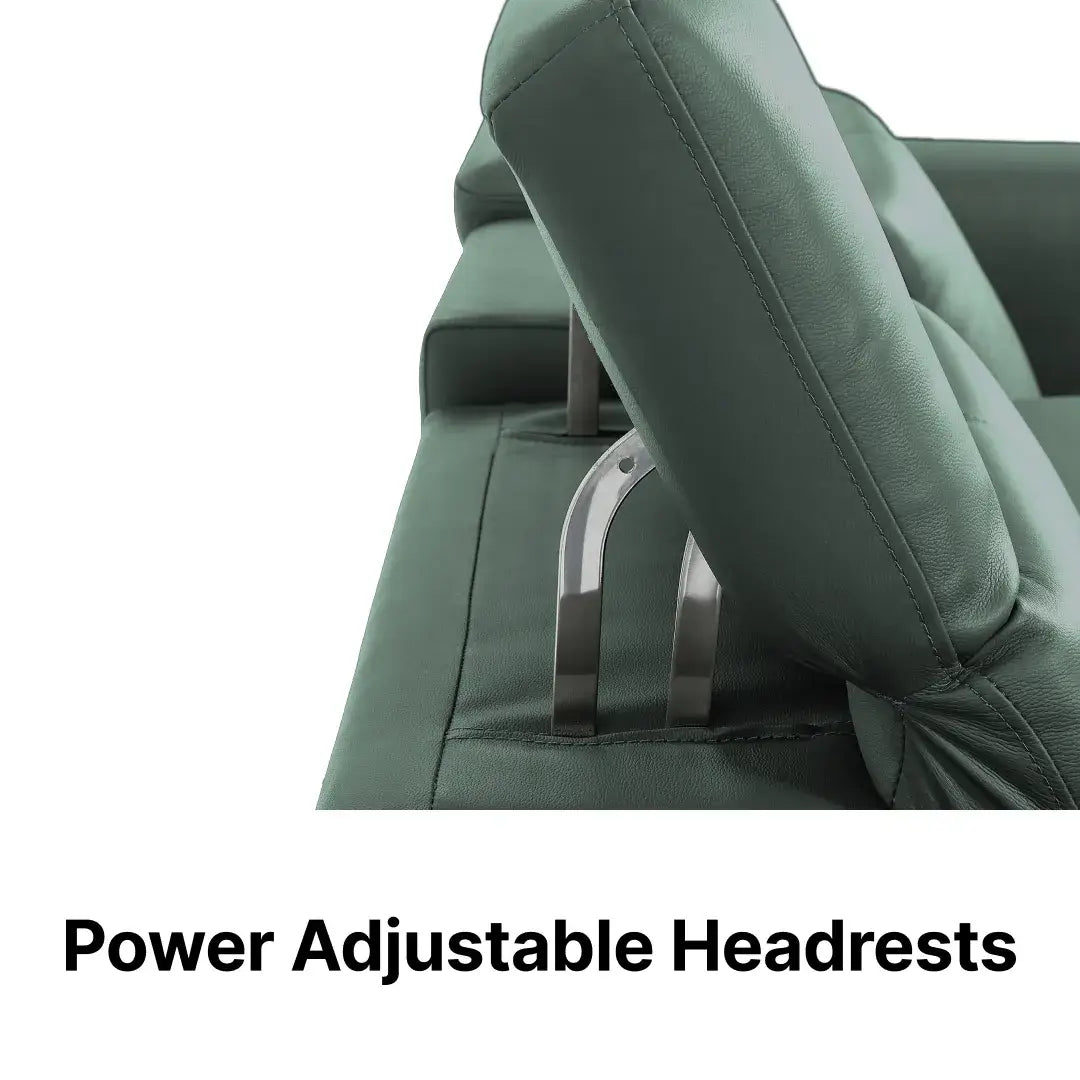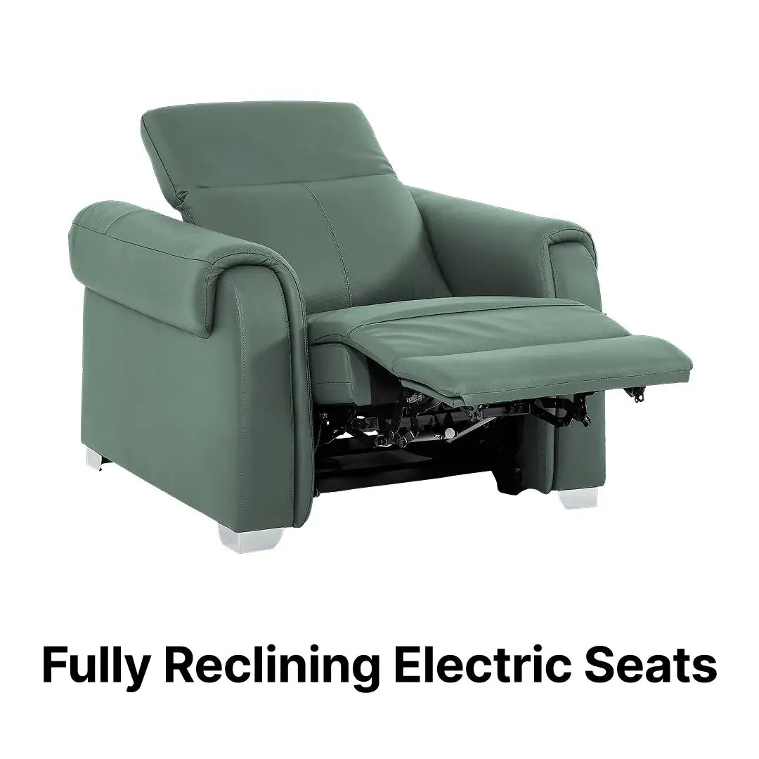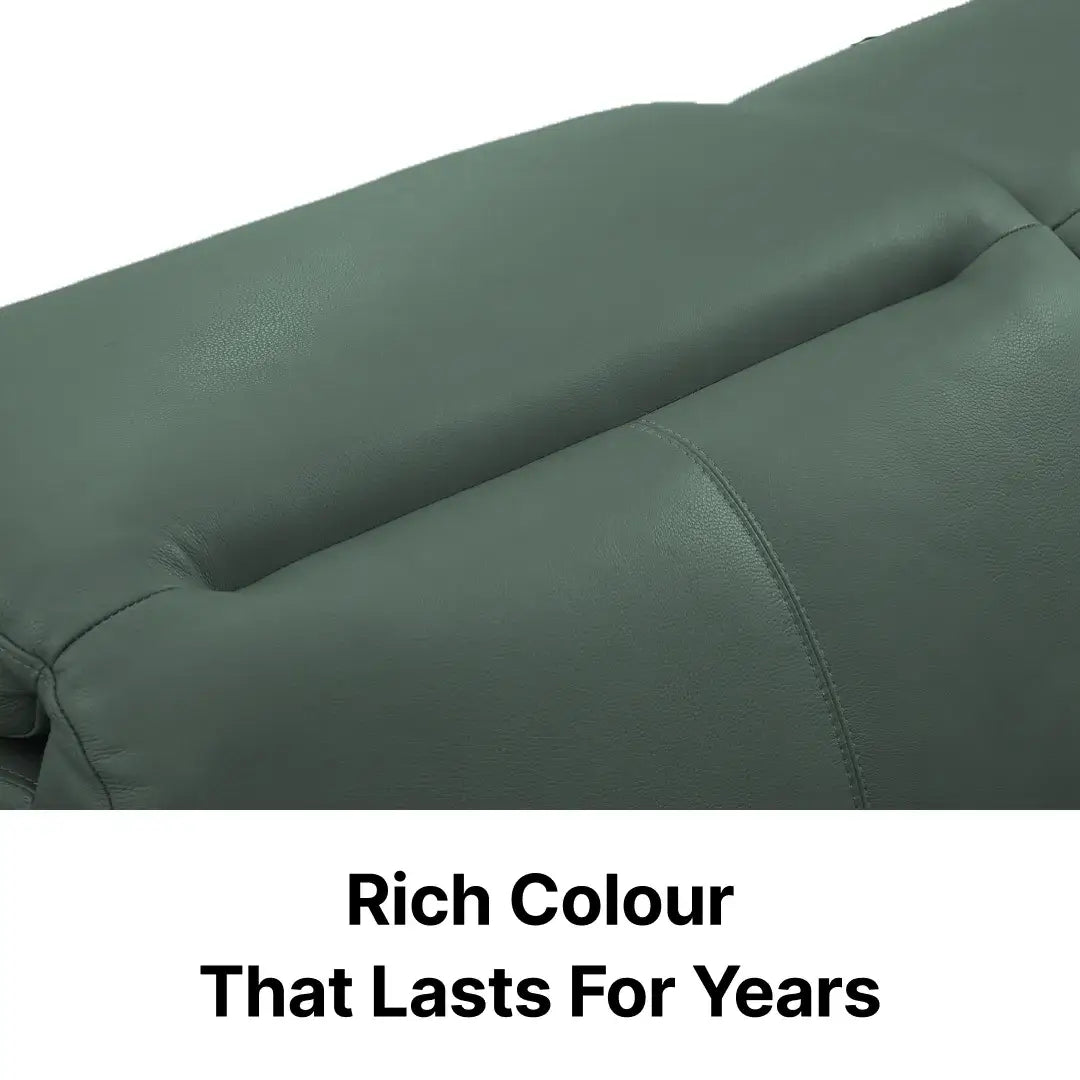 The Turin Real Leather Electric Recliner Chair turns any corner into a personal home cinema chair. Wrapped in green top-grain real leather, it blends power recline, massage, USB charging, power headrest, and supportive lumbar design — a compact, hi-tech power recliner chair that looks as good as it feels.