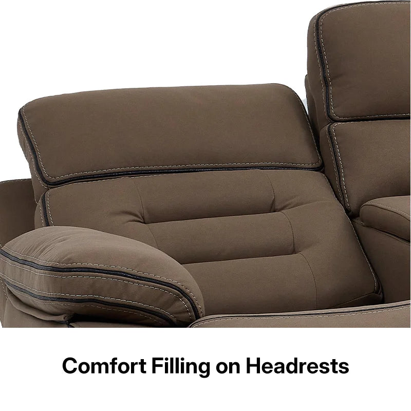 The features of the Tuscany 2+1 Sofa Set, showcasing an electric recliner mechanism and adjustable headrests. Wrapped in durable and comfortable Brown Resilience Fabric that is easy to clean, this sofa set exudes both style and functionality.