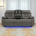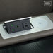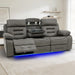 The 3-Seater "Social Hub": Features a central Drop-Down Smart Table with a Wireless Charging Pad, pop-up UK sockets, and USB ports. It also houses integrated Bluetooth speakers and retractable LED reading lights.