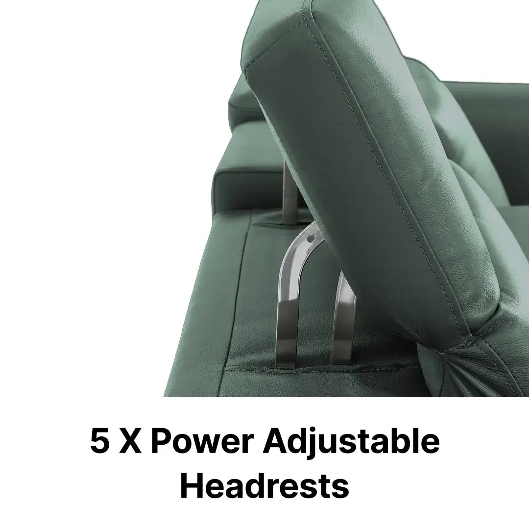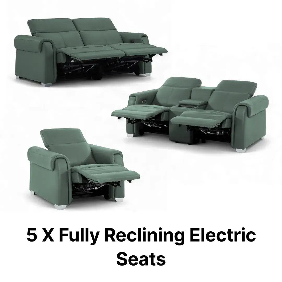 The Turin 3+2+1 Recliner Couch Set combines a 3-seater, 2-seater with console, and a recliner chair to create a cohesive home cinema sofa set in calm green. Finished in top-grain real leather, Turin blends power recline, massage, USB, power headrests and supportive lumbar design — plus a smart wireless-charging console on the 2-seater — for a sleek, hi-tech power recliner suite made for everyday luxury.