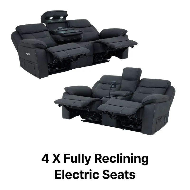 The Florence 3+2 Piece Electric Home Cinema Sofa Set in charcoal-grey resilience fabric brings cinema-grade comfort and smart tech into your home. With electric power reclining, a centre console, a fold-down table, integrated reading lamps, built-in Bluetooth speakers, and wireless charging, this cinema recliner suite delivers an immersive experience for films, gaming, or pure relaxation.