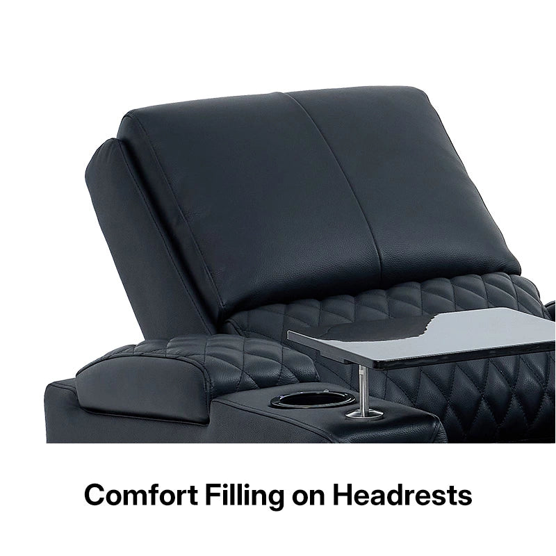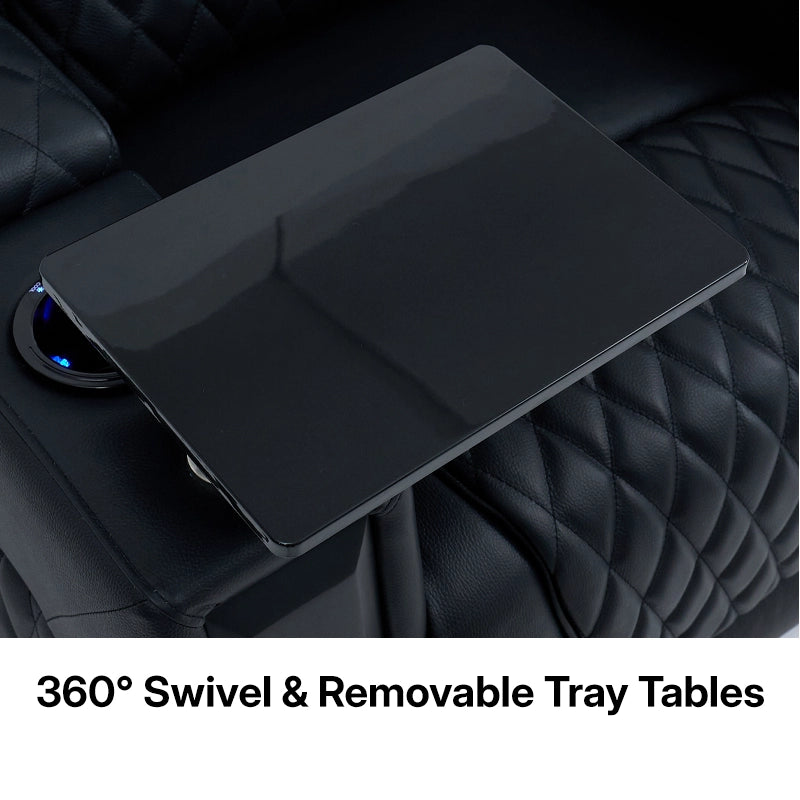 This model boasts power headrests, power lumbar support, and fully reclining seats for tailored ergonomic comfort. Featuring USB-C fast charging, LED ambient lighting, cooling cup holders, and black tray tables, the Assisi transforms your space into a high-tech entertainment hub.